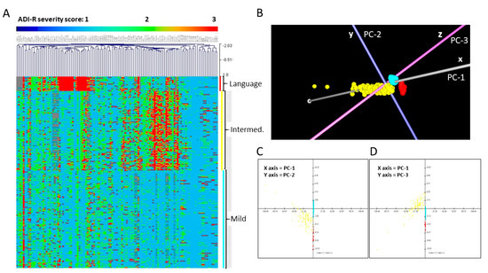 Separation of probands into three phenotypic subgroups based on cluster analyses of 123 scores on 63 Autism Diagnostic Interview-Revised (ADI-R) items for each individual. (A) Hierarchical clustering (HCL) analysis, (B–D) Principal components analysis (PCA) in 3-d (B) and 2-d projections showing PC-1 and PC-2 (C) and PC-1 and PC-3 (D). For the heatmap in (A), each row represents an individual, while each column represents a score from the ADI-R diagnostic. The range of severity scores (1–3) for each ADI-R item is represented in the color bar above the heatmap, with light blue indicating a score of 1, green-yellow indicating a score of 2, and red indicating a score of 3, which represents the most severe autism spectrum disorder (ASD) manifestation. The three ASD subgroups are identified by the vertical colored bars along the right side of the heatmap, with red indicating the severely language-impaired subgroup, yellow indicating the intermediate subgroup, and turquoise indicating the mild subgroup. This latter set of colors also applies to the subgroups shown in the PCA plots in which each point represents an individual. Note: In the heatmap (A), the large block of red columns associated with the severely language-impaired subgroup primarily corresponds to items involving spoken language on the ADI-R diagnostic.