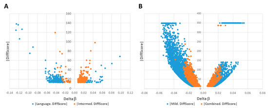 Volcano plots of significant differentially methylated regions and associated genes (DAGs) among subgroups and combined cases. |DiffScore| versus Delta β plots for significant DAGs in: (A) severely language-impaired (blue) and intermediate (red) subgroups; (B) mild subgroup (blue) and combined cases (red). Note: A |DiffScore| of 13 is roughly equivalent to a p-value of 0.05.