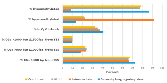 Figure 2B in comparison to that of the mild subgroup. It is notable that there are fewer significant DAGs in the combined case group compared to that of the mild subgroup (2570 vs. 4073), despite the larger number of individuals in the combined case group (292 vs. 149 case-control pairs). Figure 3 summarizes the location of the differentially methylated CpG sites relative to the transcription start site (TSS) for each case group and also the proportion of hypermethylated or hypomethylated sites in each group. In brief, more than 90% of CpG sites in all case groups were found within 1000 bp of the TSS, with the remainder less than 1500 bp away, suggesting that the majority of these sites are likely to be involved in the regulation of transcription. There are also noticeable quantitative differences in the methylation profiles among the case groups. For example, the severely language-impaired subgroup exhibits the greatest proportion of hypomethylated genes (86.8%) and the greatest proportion of CpGs (72.4%) that are closest (≤500 bp) to the TSS. By contrast, the intermediate subgroup exhibits the greatest proportion of hypermethylated genes (91.6%), while the location of the CpGs relative to the TSS is very similar to that of the mild and combined subgroups. Table S5 lists the map positions of the differentially methylated CpGs (and associated genes) in each subtype and the combined case group.