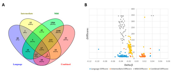 The Venn diagram in Figure 4A shows that there are 67 significant DAGs shared among the three subgroups and the combined case group, while Figure 4B shows volcano plots representing the relative distribution of these 67 DAGs in each group’s differential methylation profile. The differences in the distribution of these overlapping DAGs in each of the four groups reflect the differences that were revealed in Figure 2, with the majority of DAGs in the intermediate subgroup showing increased methylation, while these same DAGs in the severely language-impaired, mild, and combined groups show decreased methylation, as shown quantitatively in Figure 3.