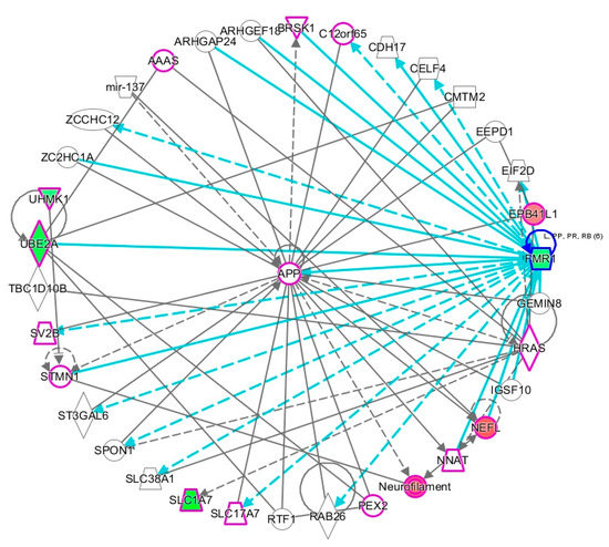 Figure 5 shows that one of the two networks of genes that are associated with ASD/ID includes FMR1, the gene responsible for fragile X syndrome, a genetic condition that is frequently associated with both intellectual disability and ASD. In a hierarchical layout of the network (Figure S9), FMR1 is placed at the top of the network, highlighting its influence on the downstream genes, which include UBE3A, an E2 ubiquitin conjugating enzyme involved in cognitive disability, and SLC1A7, a glutamate transporter that is involved in pervasive developmental disorder (also used to describe ASD), social anxiety, and fragile X.