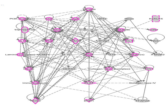 We also used IPA to analyze the 67 DAGs (from Figure 4) shared by all three subgroups and the combined case group. Figure 6 shows the top network resulting from the network prediction analysis of the shared DAGs. This network is enriched in genes associated with inflammatory responses, suggesting that neuroinflammation may be a common theme underlying core features of ASD that are manifested in all subtypes. These results collectively demonstrate the value of reducing heterogeneity by subphenotyping individuals with ASD to maximize the ability to identify not only ASD-related DAGs but also ASD-associated functions, pathways, and disorders over-represented within each subgroup. Specifically, 1.62 times as many unique DAGs (4155) are identified among the three subphenotypes in comparison to that of the combined case group (2570).