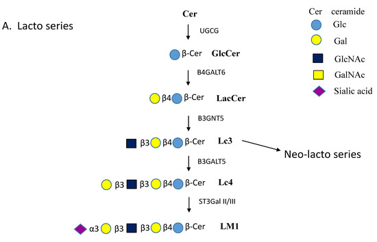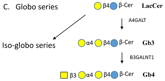 As seen in Figure 1A, β1,4-galactosyltransferase 6 (B4GALT6) synthesizes the Galβ1-4 linkage of LacCer on the luminal face of the Golgi membrane [67]. In mice, B4galt5 also synthesizes LacCer and the enzyme was found to be essential for development [68]. B4GALT5 and 6 are inverting GTs of the GT7 family with a predicted GT-A fold. LacCer is then converted further to GSLs of either the Lacto, Globo or Ganglio series [5] (Figure 1). The β1,3GlcNAc-transferase B3GNT5 (GT31) initiates production of the Lacto series that can carry multiple glycan epitopes such as blood group antigens [69]. The enzyme may also synthesize GlcNAc-GalCer. The addition of a Galβ1-3 residue to GlcNAc of Lacto series GSLs is carried out by B3GALT5 (Figure 1A). The GlcNAc residue of Neo-lacto series GSL is substituted by a Gal residue in β1-4 linkage. In the synthesis of globosides, Gb3 is synthesized from LacCer by α1,4-Gal-transferase A4GALT, followed by a transfer of GalNAc by β1,3-GalNAc-transferase B3GALNT1 to form Gb4 (Figure 1C).