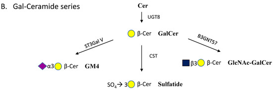 Sulfatide is a major GSL in the brain and is enriched in myelin as well as in spermatozoa. In the synthesis of sulfatide, sulfate is transferred from PAPS to the 3-hydroxyl group of Galβ-Cer by the Golgi enzyme Cer sulfotransferase (CST) [4]. CST can also sulfate the Galβ residue of LacCer and other substrates linked to a lipid-like group. Although CST has low activity towards LacCer and compounds having terminal Glcβ residues, it cannot act on substrates having terminal Galα substrates. Other rare structures based on GalCer include Galα1-3Galβ-Cer and GlcNAc-Galβ-Cer that may be synthesized by α3-Gal- and β3-GlcNAc-transferases of the Globo and Lacto series pathways (Figure 1A,C).