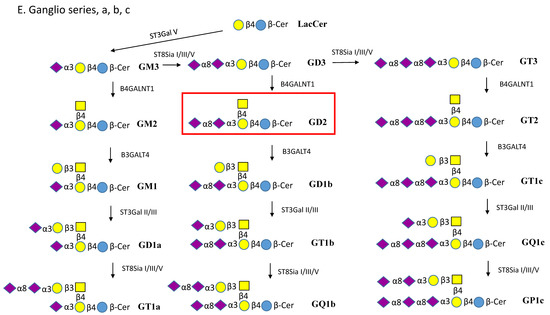 Another sialyltransferase (ST6GALNAC V) acts exclusively on GalNAc residues and transfers sialic acid in an α2-6 linkage (present in α-series gangliosides) and converts GM1b to GD1α (Figure 1D). All human sialyltransferases belong to the same GT29 family and possess sialyl-motifs [71]. A number of GTs that are primarily involved in the extension of N- and O-glycan chains of glycoproteins can also utilize GSLs as substrates (e.g., ST3Gal I, IV and VI).