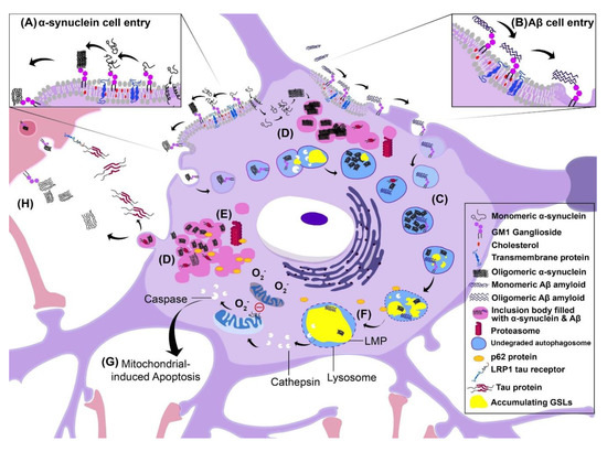 Schematic model of proposed pathophysiological mechanisms of lysosomal storage disorders (LSDs). The model is of the most affected cell type of LSDs, the neuron, and illustrates the events, which may indirectly or directly lead to cell death. A legend is presented on the right, which defines the symbols used in the figure. Several events are occurring simultaneously inside the diseased neuron: (A) α-synuclein cell entry, (B) Aβ cell entry, (C) accumulation of undegraded autophagosomes, (D) accumulation of cytoplasmic inclusion bodies filled with α-synuclein, Aβ or the Tau protein, (E) inhibition of the proteasome, (F) lysosomal membrane permeability changes, (G) mitochondrial-induced apoptosis (H) and cell–cell spreading of pathology. (A) α-synuclein enters the cell via GM1-receptor mediated endocytosis or by creating a pore in the membrane leading to the formation of inclusion bodies (seen in pink) that inhibit the proteasome and reduce degradation of materials in the cell. (B) Aβ amyloid enters the cell via the same method: GM1-mediated endocytosis. (C) Autophagosomes fill with undegraded material such as the accumulating proteins α-synuclein, Aβ and Tau. (F) Due to defective lysosomal hydrolases, GSLs accumulate in the lysosome and promote lysosomal membrane permeability (LMP). (G) Eventually the lysosome expels its contents including cathepsins. This induces mitochondrial release of caspases, which in turn cause apoptosis. Additionally, monomeric α-synuclein is capable of inhibiting mitochondrial fusion. As a result, the dying mitochondria degrade in the cytoplasm, releasing copious amounts of reactive oxygen species inducing cell death. (H) As the cell fills with undegraded autophagosomes, and harmful inclusion bodies, the cell activates secretory pathways that lead to the exocytosis of intracellular material to reduce the load, followed by endocytosis in adjacent cells. This provides a route for pathology to spread to adjacent cells. Harmful aggregates such as from Tau, α-synuclein and Aβ can be endocytosed into the adjacent cell. Specifically, Tau can interact with the receptor LRP1 to allow cell entry.