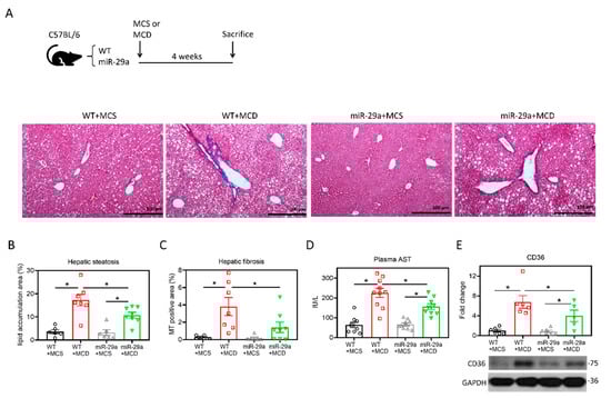 - Lin, H.Y.; Wang, F.S.; Yang, Y.L.; Huang, Y.H. MicroRNA-29a Suppresses CD36 to Ameliorate High Fat Diet-Induced Steatohepatitis and Liver Fibrosis in Mice. Cells 2019, 8, 1298. [Google Scholar] [CrossRef]