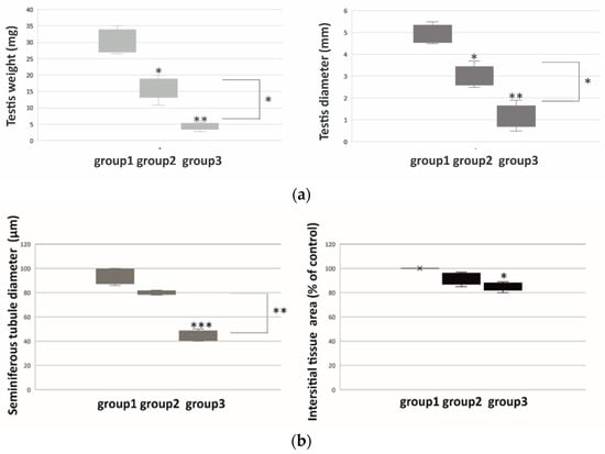 Weight and diameter (a) and seminiferous tubule diameter and interstitial tissue area (b) of regressed testes of bank voles. Boxplots represent medians ± quartile range. Significant differences between groups 1, 2 and 3 are denoted as ∗ p < 0.05, ∗∗ p <0.01 and ∗∗∗ p < 0.001. Group 1 serves as a control. Analysis was performed in triplicate.