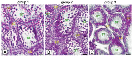 Representative microphotographs of morphology of bank vole testes with different stages of their regression (A; group 1 with the lowest regression); (B; group 2 with medium regression) and (C; group 3 the highest regression). Hematoxylin-eosin staining. Bar 45 µm. Staining was performed at three serial sections from each animal. LC-Leydig cells; ST-seminiferous tubules.