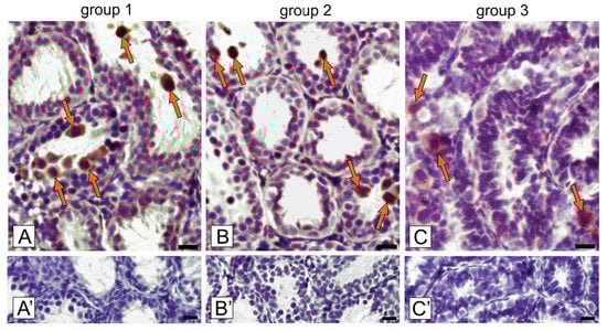 Representative microphotographs of immunohistochemical localization of p16 in bank vole testes (A; group 1 with the lowest regression, B; group 2 with medium regression; and C; group 3 with the highest regression). Staining with DAB and counterstaining with hematoxylin. Bar 45 µm. Staining was performed at three serial sections from each animal. Arrows depict senescent germ cells (group 1 and 2) and germ/Sertoli cells (group 3). A’–C’—negative controls.