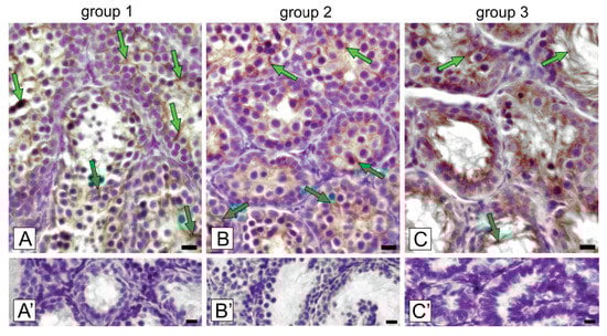The positive signal was exclusively visible in Sertoli cells with the strongest expression in regressed testes of voles of group 3. Negative controls showed no positive staining (Figure 4A’–C’).