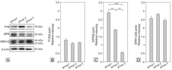 Representative blots (A) of qualitative expression and relative expression (arbitrary units) of p16 (B), ZIP9 (C) and ERK1/2 (D) in regressed bank vole testes. The relative amount of respective proteins normalized to β-actin. Relative intensity of bands from three separate analyses is expressed as means ± SD. Asterisks show significant differences between the groups 1, 2 and 3. Significant differences are denoted as ∗∗ p <0.01 and ∗∗∗ p < 0.001.