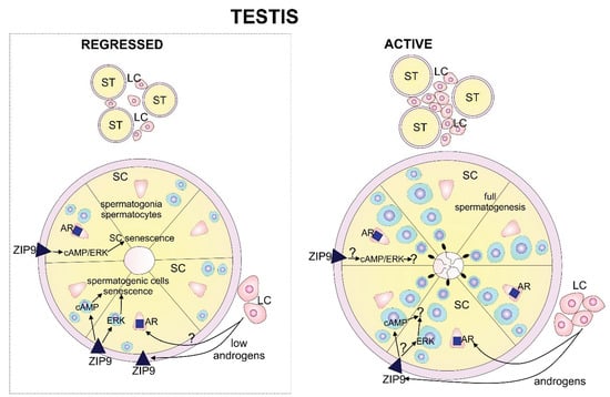 The potency of the negative feedback actions of testosterone is one of the principal mechanisms driving seasonal changes in reproductive system function [19,20]. Findings, both in vitro and in vivo, in prostate cancer cells revealed that androgen deprivation induces senescence, a stress response that stops the proliferation of dysfunctional cells [21]. These cells remain metabolically active and have heightened survival, which makes them highly viable and resistant to apoptosis [22]. Moreover, androgen activation of intracellular signaling pathways via increase of cAMP, activation of extracellular signal-activated kinase 1/2 (ERK1/2) and activation of transcription factors were recently demonstrated in the developing testes [23]. Cell membrane ZRT and Irt-like Protein 9 (ZIP9), belonging to zinc transporters, were shown to be involved in these quick signal transduction pathways. To date, only initial efforts have been undertaken to understand the role of membrane androgen receptor ZIP9 in the male gonad. Historically, it has been generally accepted that the nuclear androgen receptor expressed by testicular somatic cells is a crucial component of androgen signaling [24].