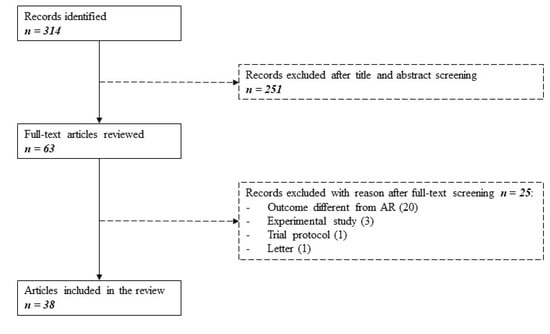 The main reason for exclusion was the evaluation of a different outcome instead of AR (e.g., chronic or late rejection, graft dysfunction, graft failure). Experimental studies, one trial protocol, and one letter were also excluded. A total of 38 remaining articles, published between 1 January 2015 and 31 May 2020, were finally included. No additional articles were included from the reference lists.