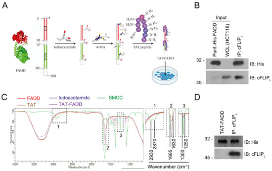 Human FADD protein conjugated with TAT peptide. (A) Schematic diagram showing the chemical conjugation of FADD protein (PDB ID-2GF5) with linker iodoacetamide and SMCC (4-MA) followed by TAT peptide. (B) In vitro protein interaction with purified His-tagged FADD and whole cell lysate (WCL) from HCT 116 cells, the immunoprecipitated (IP’ed) His-FADD interacts with binding partner cFLIPL protein, input lanes represent loading controls, as assessed by Western blot, molecular weight marker left to each blot. (C) The FT-IR analysis of TAT-FADD conjugate; inset box 1, 2, and 3 represent the corresponding peaks from the representative FT-IR spectrum. (D) In vitro protein interaction with His-taged TAT-FADD conjugate and whole cell lysate (WCL) from HCT 116 cells, the IP’ed His (TAT-FADD) interacts with cFLIPL protein, as assessed by Western blot, molecular weight marker left to each blot.