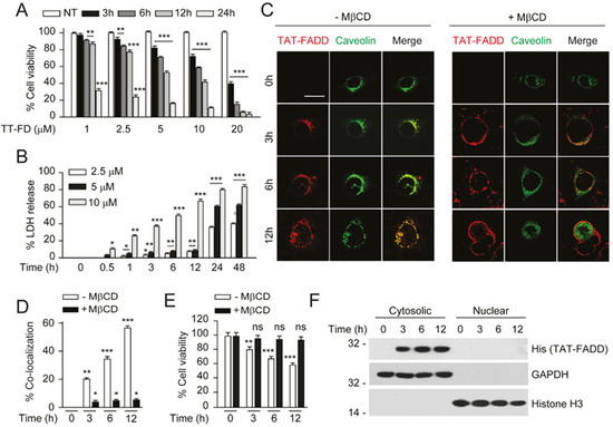 TAT-FADD efficiently delivered inside the cells and retained in the cytoplasm. (A,B) HCT 116 cells were treated with TAT-FADD (TT-FD) at the mentioned concentrations for given time points and, (A) analysis of cell viability and (B) percent LDH release. (C–E) HCT 116 cells were transfected with GFP-Caveolin1 for 24 h followed by pre-incubation with MβCD (+MβCD; right panel) for 4 h, further cells were left untreated (0 h) or treated with 5 µM of TAT-FADD for 3–12 h, (C) the internalized TAT-FADD was immunostained with anti-His antibody (His tagged FADD) followed by counterstaining with DAPI and analyzed by confocal microscopy, representative of 25 cells from 3 different fields; scale bar 10 µm and (D) the % localization of TAT-FADD with GFP-Caveolin1 from ‘C’ was calculated with Image J software, (E) analysis of cell viability in the absence (−) and presence (+) of MβCD. (F) HCT 116 cells were treated with 5 µM of TAT-FADD for 3–12 h followed by analysis of cytosolic and nuclear fractions; GAPDH and histone H3 was used as cytosolic and nuclear protein markers, respectively, molecular weight marker left to each blot. The 0 h represents untreated cells. In (A), significance compared between non-treated (NT) and TAT-FADD treated cells; in (B), significance compared between non-treated (0 h) and TAT-FADD treated cells; in (D,E), significance is compared between unprimed (-MβCD; white bars) and primed (+MβCD; black bars) cells treated with TAT-FADD. h, hours; ns, non-significant. Mean ± SD; * p ≤ 0.05, ** p ≤ 0.01, and *** p ≤ 0.001.