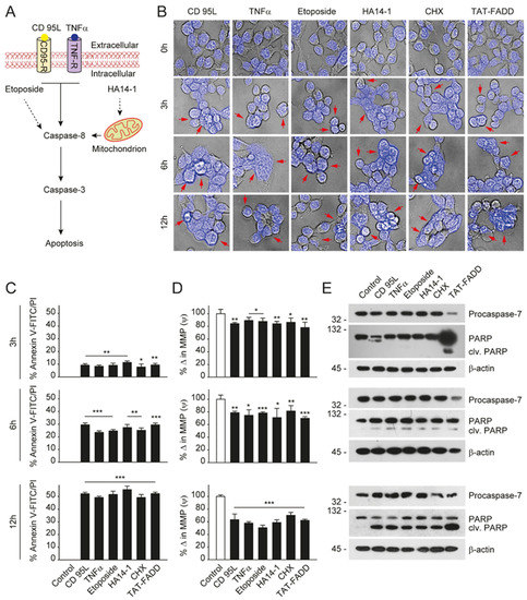 TAT-FADD’s pro-apoptotic effect is compared with conventional apoptosis inducers. (A) Schematic diagram representing the target site of proposed apoptosis inducers. (B–E) HCT 116 cells were treated with CD 95L (200 ng/mL), TNF-α (50 ng/mL), etoposide (50 µM), HA14-1 (5 µM), protein translational inhibitor cycloheximide (CHX, 5 µg/mL), and TAT-FADD (5 µM) alone for the mentioned time points, (B) The bright field images of cells counterstained with DAPI, post treatments, representative of 150 cells from 3 independent fields, scale bar 5 µm, (C) % apoptotic death by a Tali™ image-based cytometer, (D) % change in MMP and (E) expression of Procaspase-7 and cleavage of PARP by Western blot analysis, molecular weight marker left to each blot. In (C,D), significance compared between non-treated (0 h, white bars) and treated cells (black bars). h, hours; clv, cleaved; CD95-R, CD95 receptor; TNF-R, TNF receptor; MMP, mitochondrial membrane potential. Mean ± SD; * p ≤ 0.05, ** p ≤ 0.01, and *** p ≤ 0.001.