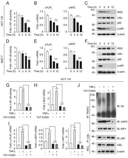 TAT-FADD suppresses constitutive and TNF-α-primed NF-κB activation in cancer cells. (A–C) HCT 116 cells were treated with 5 µM of TAT-FADD for 3–12 h and (A) NF-κB luciferase activity, (B) mRNA expression of cFLIPL and cIAP2, and (C) expression of NF-κB signaling protein, molecular weight marker left to each blot. (D–F) MCF-7 cells were treated with 5 µM of TAT-FADD for 3–12 h and (D) NF-κB luciferase activity, (E) mRNA expression of cFLIPL and cIAP2, and (F) expression of NF-κB signaling protein, molecular weight marker left to each blot. Control represents untreated cells. (G–J) HCT 116 cells were primed with TNF-α (10 ng/mL) for 12 h followed by treatment of 5 µM TAT-FADD for 6 h and (G) NF-κB luciferase activity, (H,I) mRNA expression of (H) Bcl2 and (I) cFLIPL, cIAP2 and RIP1, (J) TRAF2 was immunoprecipitated (IP) followed by binding analysis of ubiquitin, cIAP2, and RIP1 protein by Western blot, molecular weight marker left to each blot. Control represents untreated cells. In (A,B,D,E), significance compared between non-treated (represents as 0 h) and TAT-FADD-treated cells; in (G–I), significance is compared between non-treated (white bars) and TNF-α-primed cells (gray bars); and between TNF-α-primed cells and TAT-FADD-treated cells (black and dark gray bars respectively). h, hours; WCL, whole cell lysate. Mean ± SD; * p ≤ 0.05, ** p ≤ 0.01, and *** p ≤ 0.001.