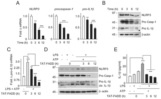 TAT-FADD suppresses proinflammatory activation of IL-1β. (A,B) HCT116 cells were treated with 5 µM of TAT-FADD for 3–12 h, (A) mRNA expression of NLRP3, procaspase-1, and pro-IL-1β, and (B) endogenous expression of NLRP3, procaspase-1 (pro Casp-1), and pro IL-1β by Western blot, molecular weight marker left to each blot. The 0 h represents untreated cells. (C–E) HCT 116 cells were primed with LPS (100 ng/mL, 12 h) and ATP (5 mM, 2 h) followed by treatment with 5 µM of TAT-FADD for 3–12 h and (C) mRNA expression of pro-IL-1β, (D) expression levels of endogenous NLRP3, procaspase-1, and pro IL-1β by Western blot, molecular weight marker left to each blot, and (E) levels of matured IL-1β was measured by ELISA assay from the culture supernatant. In (C,E) (white bar) and in (D) (lane 1), it represents un-primed and non-treated cells for 12 h taken as controls. In (A), significance is compared between non-treated (represents as 0 h) and TAT-FADD-treated cells; in (C), significance compared between non-treated (white bars) and LPS with ATP-primed cells (gray bars); and between LPS with ATP primed cells treated with TAT-FADD treated cells (black & dark gray bars respectively). h, hours. Mean ± SD; ** p ≤ 0.01 and *** p ≤ 0.001.