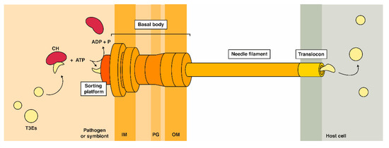 In contrast to bacterial proteins post-translationally transported through the general secretion (Sec) or twin-arginine translocation (Tat) dependent universal pathways, T3Es typically lack a conserved cleavable secretion signal [18], but possess an intrinsically disordered N-terminal ~20 amino acid long sequence enriched for serine, threonine, isoleucine and proline residues [19,20,21] and often a downstream 20 to 50 amino acid long chaperone-binding domain (CBD) [22]. Newly synthesized T3Es are generally believed to be kept in a partially unfolded state by chaperones that also target them to the T3SS sorting platform [10,23]. Only upon contact with the host, hierarchical secretion of the effectors by an ATP and proton-motive force-driven secretion mechanism through the T3SS is fully engaged. More specifically, at the sorting platform, effector proteins are stripped of their chaperones and further unfolded through ATPase activity, enabling their successive passage through the 20 Å hollow needle of the T3SS (Figure 1) [24]. Subsequent cytosolic delivery of the effectors in the host cell prompts folding into their active protein conformation. Although T3Es are thought to remain in an unfolded and thus inactive state inside bacteria, markedly, very recently, intra-bacterial enzymatic glycosylation activity of the C. rodentium non-LEE (locus of enterocyte effacement)-encoded effector NleB was demonstrated, which challenges the envisioned idea of T3Es residing dormant inside the pathogen [25].
