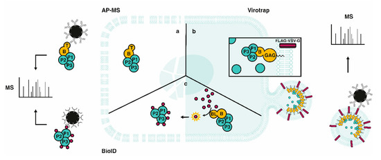 Complementary MS-based co-complex platforms to capture protein–protein interactions. (a) AP-MS; In AP-MS, the bait protein (B) is fused to an epitope tag (T) that has a high affinity to an immobilized antibody. The bait interactome (P1-P3) is co-purified after native cell lysis and subsequently identified through mass spectrometry (MS). (b) Virotrap; Virotrap omits the need for cell lysis by the genetic fusion of a bait to the myristoylated (zigzag line) human immunodeficiency virus type 1 (HIV-1) GAG protein. Expression of the fusion protein elicits the aggregation of the GAG portion at the plasma membrane, enabling the budding of virus-like particles (VLPs) and “trapping” of host preys inside VLPs. Anti-FLAG purification of the VLPs in the culture medium is followed by MS-based analysis of the VLP content (c). BioID; In BioID, the genetic fusion of a protein biotin ligase (BL) to a protein of interest, or bait (B), results in the in vivo biotinylation of interacting prey (P) proteins that are captured after lysis via streptavidin-based purification for subsequent MS-based analysis. Purple circles represent biotin.