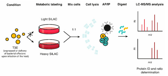 Classical AP-MS data only provides a static view of protein complexes. To facilitate the study of dynamic and regulated interactions, quantitative proteomics approaches have been implemented easing MS data interpretation and analysis. Metabolic protein labeling (e.g., stable isotope labeling of amino acids in cell culture (SILAC)) can be used to quantify relative differences in protein levels among light and heavy stable isotope-labeled samples (Figure 3) [45]. In case of SILAC, cells are differentially grown in medium containing either regular amino acids or amino acids (usually arginine or lysine) enriched with heavy carbon-13 (13C) and/or nitrogen-15 (15N) atoms, i.e., isotopologs. Consequently, the proteomes matching distinct experimental conditions are mass encoded when pooled, thus enabling the MS-based determination of (differences in) relative protein abundances (of interactors). When SILAC is coupled with IP, the protein lysates of the differentially SILAC-labeled cell populations undergo IP specific to the (tagged) bait protein (ectopically) expressed, added recombinantly, or—in case of effector biology—delivered in the context of a host-microbe interaction in a differentially SILAC labeled sample. In this way, relative differences in eluate protein levels can be determined by differential MS-based analysis, thereby pointing to potential interactors of the effector under study (Figure 3). SILAC is rarely used in planta due to the autotrophic nature of plants and thus poor metabolic labeling efficiency, although some efforts have been made (reviewed in [46]). Rather, plant researchers rely on post-metabolic labeling strategies or alternatively, label-free quantification (LFQ) for comparative quantitative proteomics.