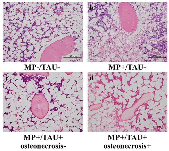 1], methylprednisolone (MP) 20 mg/kg was injected into a gluteus muscle only once in 15 rabbits of MP+/TAU− group. In 15 animals of MP+/TAU+ group, after MP injection into a gluteus muscle, taurine 100 mg/kg was injected via an auricular vein for 5 continuous days. A control group was also prepared in which physiological saline 3 mL was injected into a gluteus muscle in 15 rabbits (MP−/TAU− group). The animals in all of the groups were sacrificed 2 weeks later with thiopental sodium (NIPRO ES Pharma, Osaka, Japan) delivered by rapid injection via an auricular vein. The bilateral femora were then quickly resected. After fixation of the resected femurs in 10% neutral buffered formalin, decalcification was done with formic acid, and paraffin embedded specimens were cut into 4 μm thick sections with a microtome. This study was conducted in accordance with all guidelines of the Animal Research Committee of Kanazawa Medical University (#2018-13; approval date: 1 April 2020).