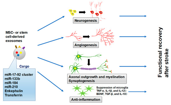 Geng et al. examined the therapeutic effect of adipose-derived stem cells (ADSCs), and they focused on the promising effects of exosomal miR-126 that was poorly expressed in the plasma of stroke patients [46], and overexpression and knock-down of miR-126 for ADSCs were used. In rats subjected to tMCAO for 2 h, mNSS scores and motor function on the foot-fault test were significantly improved in the order of treatment with miR-126-overexpressed exosomes, naïve exosomes, exosomes with miR-126 knock-down, and vehicle treatment. Neurogenesis and angiogenesis were further enhanced by ADSC-derived miR-126-overexpressed exosomes, together with suppression of microglial activation and TNF-α and IL-1β production after ischemia [46].