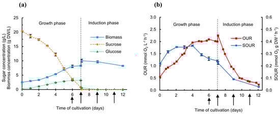Sucrose in the culture medium was hydrolyzed during heat sterilization (by autoclaving) and diluted by 20% v/v inoculation, leading to ~20 g/L at the beginning of cultivation (Figure 1a). The gradual decrease in sucrose concentration in the medium is caused by invertase enzymes in the rice cell wall that convert sucrose to glucose and fructose, which are then taken up by rice cells. At day 7 of cultivation, sucrose and glucose concentrations were 0.8 g/L and 3.2 g/L, respectively, before the media exchange, and 0 g/L and 0.6 g/L, respectively, after the media exchange. Even though sugar concentrations were not measured at day 8 of cultivation (day 1 following induction) in this study, our previous reports found that residual sucrose and glucose were usually depleted by the end of the first day of induction [,,].