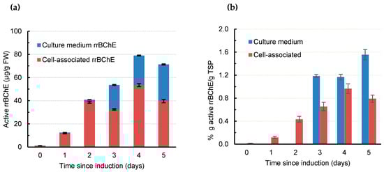 Production of rrBChE during the induction phase in a 5 L bioreactor. (a) Active rrBChE normalized by biomass fresh weight, and (b) rrBChE purity defined as % g active rrBChE per g total soluble protein (TSP). Error bars represent standard deviation from three technical replicates.