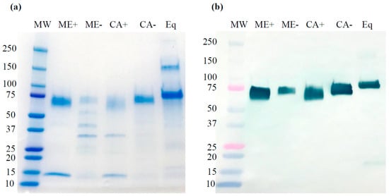 SDS-PAGE (a) and Western blot (b) run under reducing conditions for purified rrBChE with and without kifunensine treatment. Lane MW, molecular weight standard proteins; lane ME+ and lane ME-, 15 µL (~1580 ng rrBChE) and 30 µL (~70 ng rrBChE) of purified culture medium rrBChE with and without kifunensine treatment, respectively; lane CA+ and lane CA-, 30 µL (~585 ng rrBChE) and 15 µL (~1920 ng rrBChE) of purified cell-associated rrBChE with and without kifunensine, respectively; lane Eq, ~1680 ng of purified equine BChE. CA and ME stand for cell-associated rrBChE and culture medium rrBChE, respectively, while + and - refer to with and without kifunensine treatment, respectively.
