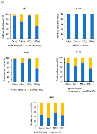 N-glycoforms of rrBChE from cell extract and culture medium in the absence of kifunensine are comparable in all N-glycosylation sites (Figure 4c and Figure S1), indicating that rrBChE from the culture medium was fully glycosylated throughout the secretory pathway and secreted outside the cell membrane. It could also be interpreted that the majority of cell-associated rrBChE analyzed at day 5 following induction was secreted outside of the cell membrane but likely trapped in apoplast, cell wall matrix, and/or cell aggregates. In contrast, culture medium and cell-associated rrBChE produced under kifunensine treatment showed significantly different N-glycoforms, implying interference in the N-glycosylation pathway due to partial α -mannosidase I inhibition by kifunensine. For example, in the presence of kifunensine, the relative abundances of rrBChE Man5/6/7 structures from the culture medium, ME(+) and from the cell extract, CA(+) were 47% and 29% at site N57, respectively, and 44% and 19% at site N256, respectively (Figure 4a and Figure S1), indicating further mannose trimming of intracellular rrBChE by functional α-mannosidase I. Perhaps it takes some time for kifunensine to be taken up by the rice cells and transported to the ER and the Golgi to inhibit α-mannosidases I, and in the meantime, some rrBChE molecules are glycosylated in a traditional manner because α-mannosidases I are functional.