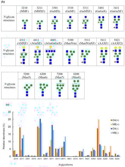 ), xylose. (c) The relative abundance (%) of overall (combining all sites) N-glycoform distributions of rrBChE with and without kifunensine treatment. CA and ME stand for cell-associated rrBChE and culture medium rrBChE, respectively, while + and - refer to with and without kifunensine treatment, respectively.