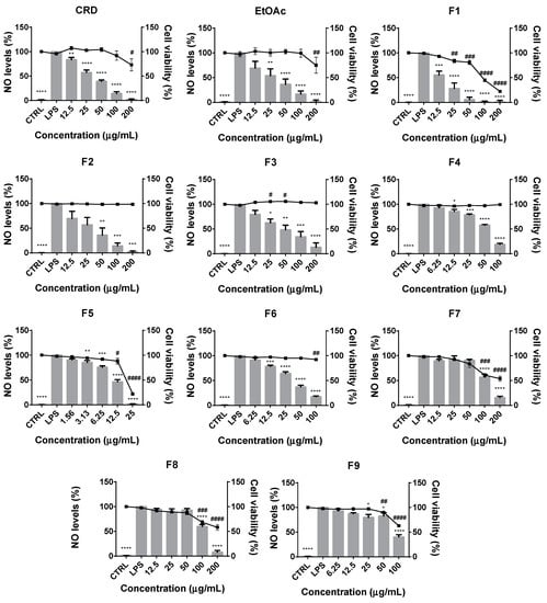 Effects of F. vesiculosus crude extract (CRD), ethyl acetate fraction (EtOAc) and subsequent subfractions (F1–F9) on the NO• production (grey bars) and viability (■) of LPS-stimulated Raw 264.7 cells. Data represent the mean ± SEM from at least 3 independent experiments. * p < 0.05, ** p < 0.01, *** p < 0.001 and **** p < 0.0001, indicate that NO• production is significantly different from the positive control (with LPS) and # p < 0.05, ## p < 0.01, ### p < 0.001 and #### p < 0.0001 indicate that cells viability are statistically different from the negative control (CTRL, without LPS), as determined by one-way ANOVA followed by Dunnet’s post hoc test.
