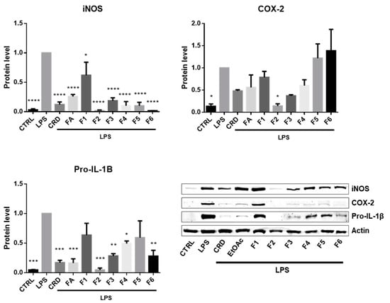 Therefore, in order to deeply explore the possible involvement of the F. vesiculosus phlorotannins in the modulation of key inflammatory proteins expressed by Raw 264.7 in the presence of a pro-inflammatory stimulus, we further performed Western blotting with the samples that showed at least 25% inhibition of LPS-induced NO• production without affecting cell viability below 90% (200 μg/mL of F2 and F3, 100 μg/mL of crude, EtOAc, F4 and F6, and 12.5 μg/mL of F1 and F5).