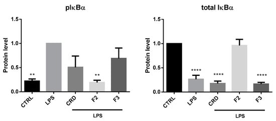 As depicted in Figure 3, the presence of F2 completely abrogated the effects of LPS, maintaining the levels of phosphorylated and total IκBα at the basal levels. As this protein is responsible for maintaining NF-κB sequestered and inactive in the cytoplasm, the inhibition of its phosphorylation and degradation indirectly indicates that the NF-κB translocation to the nucleus was blocked and, consequently, that its transcriptional activity was inhibited. By contrast, the treatment with both CRD and F3 did not significantly affect the phosphorylation of IκBα, although a slight decreasing tendency could be noted. Nevertheless, none of the these two samples were able to prevent the decrease in the total IκBα levels, which means that this protein was still being degraded by the proteasome, and therefore the NF-κB was being freed to translocate to the nucleus.