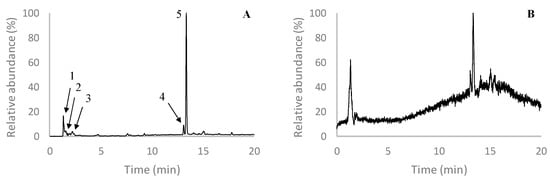 Chromatographic profile at 280 nm (A) and total ion chromatogram (B) of F2. Peaks marked with numbers correspond to the tentatively identified compounds represented in Table 2.