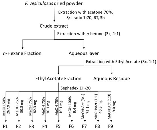 Flowchart for extraction and fractionation of phlorotannins from F. vesiculosus. F1 to F9 represent nine subfractions obtained from the Sephadex LH-20 column chromatography with a solvent system of decreasing polarity. S/L—solid/liquid ratio (g/mL), RT—room temperature, MeOH—methanol, Act—acetone.
