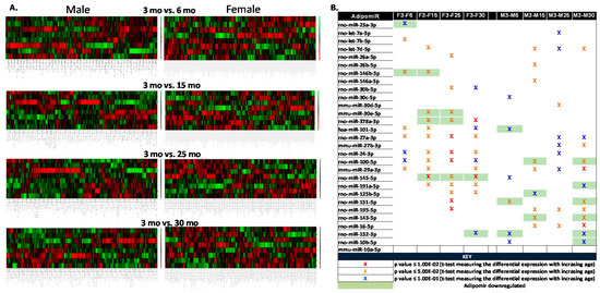 Longitudinal changes in adipose-specific microRNAs (adipomiRs): Small-RNA sequencing was performed on visceral adipose tissue obtained from all ages in both the sexes (n = 4/age/sex). (A) Heat map depicts the differentially expressed adipomiRs with age (6, 15, 25 and 30 month (mo in the figure) old) compared to 3 month old male and female FBN rats. (B) A list of the differentially expressed adipomiRs in both sexes. Green shade indicates downregulation of the respective adipomiR. Red X—p-value ≤ 1.00 × 10−2; orange X—p-value ≤ 5.00 × 10−2 and blue X—p-value ≤ 1.00 × 10−1 (t-test measuring the differential expression with increasing age compared to 3 mo rats in both sexes).