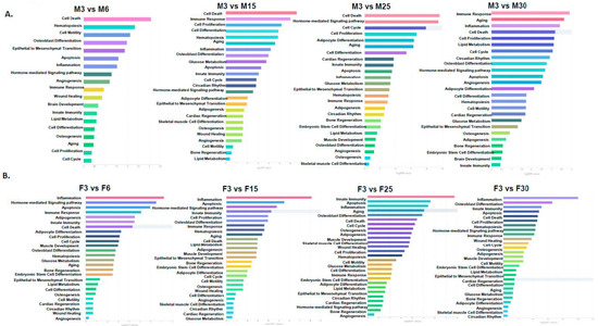 Functional enrichment analysis of the differentially expressed adipomiRs: TAM 2.0 was used to determine microRNA (miRNA)-functional enrichment analysis of adipomiRs that were differentially expressed in each group compared to the 3 mo rat (A) Male and (B) Female rats. The functions are listed according to the highest to the lowest association with the differentially expressed adipomiRs.