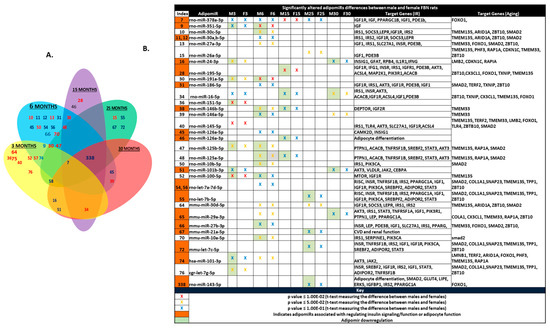Since we observed longitudinal changes in expression of adipomiRs within each sex with age, we next compared the differential expression of these miRNAs between males and female rats with increasing age. The lotus diagram and the table (Figure 3A,B) show the differentially expressed adipomiRs between the two sexes at each age group (example, M-3 vs. F-3; M-6 vs. F-6). The adipomiRs that were downregulated in one sex compared to the other sex are shown with green shading in Figure 3B. There were several adipomiRs that were downregulated in male rats compared to female rats at all age groups. Downregulation of microRNAs generally results in induction of their target genes.