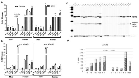 ADARs (ADAR 1–3) catalyze the deamination of adenosine (A) to inosine (I), which results in the inosine being recognized as guanosine (G) during translation. This A–G transformation leads to either mis-sense altered amino acids within the encoded protein during translation or the resulting ‘G-U’ wobble pairs increases risk for degradation [56]. The original function of ADARs was thought to be its re-coding capacity, however it was discovered it also targets non-coding regions and, hence, numerous ADAR-miRNA pathways were identified [29,57]. We also observed sexual dimorphism in the expression levels of ADAR1 and 2. In males, there was a gradual increase in the levels of these enzymes with the oldest (30 months) rats having the highest expression. Whereas, the expression levels of both the enzymes increased at 6 months of age and this was maintained at all older age groups compared to 3 month old rats. Since ADAR2 is inducible, we only determined its protein expression, which showed a gradual increase in expression with age in female rats. Again, in males, the increase in expression was seen more in older rats. These differences may be attributed to sex-hormones regulating ADAR expression and activity. There are earlier studies in Drosophila [58] and human brains [59] where sex-dependent differences in overall ADAR-mediated editing have been observed.