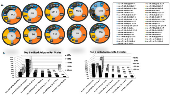 Longitudinal changes in edited adipomiRs: (A) Quantitative analysis of the edited adipomiRs from male and female FBN rats as determined by small-RNA sequencing. Each doughnut chart represents the percent of the highly edited adipomiRs in each age group in the two sexes. The larger the slice within the doughnut graph, the larger editing of that individual adipomiR. The table provides the IDs of the adipomiR represented in the slices of the doughnut graphs. (B) The graphical representation of the top 6 highly edited adipomiRs at each age group in both the sexes.
