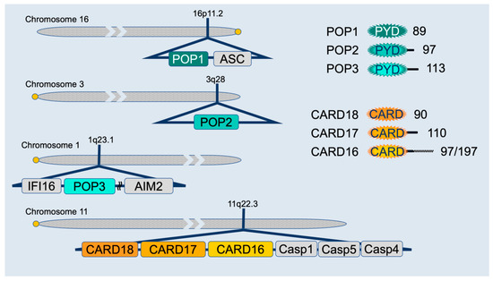 Both the PYD and CARD belong to the death domain fold (DDF) superfamily of protein–protein interaction domains, present in proteins regulating cell death and inflammation. They contain a bundle of six anti-parallel α-helices with a charged outer surface and a stabilizing hydrophobic core [138,139,140]. PYDs and CARDs are about 80–90 amino acids long and commonly mediate homotypic interactions, with the charged and hydrophobic surface patches dictating binding specificities. Proteins usually contain a CARD or PYD in combination with other domains to enable complex formation and signaling [89,141]. While CARDs can be on the N- or C-terminus of proteins, PYDs are exclusively present at the N-terminus of proteins, and a PYD or a CARD is present in all inflammasome core proteins, including caspases, NLRs, ALRs, ASC, and Pyrin [138]. However, particularly CARD-containing proteins, are also linked to other signaling pathways, including NF-κB activation. As discussed above, inflammasome assembly relies on PYD- and CARD-mediated protein interactions to nucleate and perpetuate protein polymerization [91,92,93]. Therefore, small endogenous proteins encoding a single PYD or CARD provide a unique, competitive binding mechanism to interfere with PYD and CARD-mediated interactions of multi-domain proteins, and consequently, interfere with assembly and nucleation of inflammasome components (Figure 1). Furthermore, interference with critical interactions reduces the local density of essential inflammasome components and thereby raises the threshold for inflammasome activation. The PYD-only proteins (POPs) POP1 (PYD containing 1, PYDC1), POP2 (PYDC2), and POP3 (PYDC5) can bind to inflammasome sensors or the adaptor ASC, but all three human CARD only proteins (COPs), namely CARD16 (COP/PSEUDO-ICE), CARD17 (INCA), and CARD18 (Iceberg), which share various degrees of similarity to the caspase-1-CARD, can bind to caspase-1 and only CARD16 can also bind to the ASC-CARD. Intriguingly, all COPs and POPs are absent from rat and mouse genomes but are specifically encoded in humans and higher primates [142,143,144]. The genomic localization of POPs is in close proximity to other PYD containing proteins, while COPs localize in close proximity to the inflammatory caspase cluster and likely originated from a series of exon duplication events and retro-transposition mechanisms (Figure 2) [143]. A fourth POP, POP4, is encoded by the human NLRP2P pseudogene, but only consists of 45 amino acids that form the first two α-helices, rather than a complete PYD. Nevertheless, POP4 is able to inhibit the NF-κB pathway, but not inflammasomes [145].