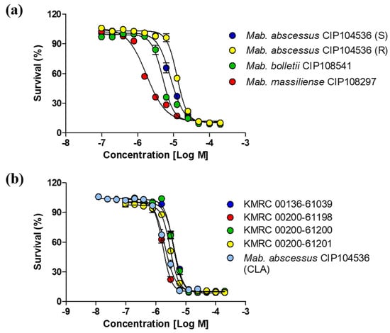 In this study, we evaluated the activity of etamycin in three different ways and showed a similar anti-M. abscessus activity in all three models. First, we tested the in vitro susceptibility of M. abscessus to etamycin. As shown in Figure 2a,b, the survival of all three M. abscessus subspecies was greatly decreased in the presence of etamycin and in vitro activity comparable to that of clarithromycin. Furthermore, we evaluated the antibacterial activity of etamycin against clinical strains of M. abscessus and found that etamycin was equally effective against M. abscessus clinical isolates from different sources, selected from the Korean Mycobacterial Resource Center (KMRC).