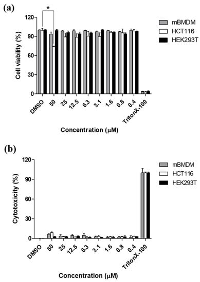 To determine whether etamycin influences the cell number, the cell viability at different concentrations of etamcyin was assessed 3 days after the treatment using the Cellrix® Viability assay kit. The results of the effect of etamycin on the viability of murine bone marrow-derived macrophages (mBMDMs), human colon cancer cells (HCT116), and human embryonic kidney cells (HEK293) are presented in Figure 3a. No difference could be seen at any concentration for mBMDM and HEK293, whereas for HCT116 cells, the 50 μM (p < 0.05) groups had reduced cell viability compared with the DMSO control. Furthermore, to determine whether etamycin can enhance cell death in various cell types, we also examined the cytotoxicity of etamycin in mBMDM, HCT116, and HEK293 cells using the lactate dehydrogenase (LDH) assay after 3 days of treatment. As shown in Figure 3b, no significant cytotoxicity was observed in any of the cells tested. However, 1% Triton-X control showed approximately 100% cytotoxicity. These results suggest that etamycin does not affect the cell number and has no toxic effect on different cell types except for the highest concentration on the HCT116 cell line.