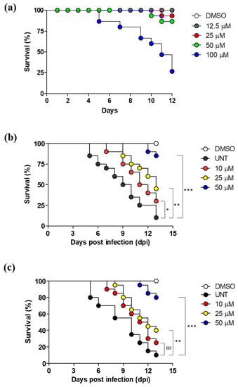 To determine the therapeutic potential of etamycin, the drug in vivo efficacy was evaluated in zebrafish after infection with mWasabi protein-expressing M. abscessus, as described previously [11]. As M. abscessus CIP 104536T (R) is hypervirulent in animal models, we evaluated the activity of etamycin against M. abscessus CIP 104536T (R) at concentrations of 10, 25, and 50 µM [12]. As the first approach, we investigated whether increasing the etamycin dose would consequentially expand the lifespan of M. abscessus CIP 104536T(R)-infected ZF. For this, the percentage survival of ZF was monitored using the Kaplan–Meier method for 13 dpi. The etamycin contained fish water that was replaced daily. As shown in Figure 5b, approximately 90% of fish in the untreated group died at 13 dpi. However, the etamycin treated group resulted in significantly increased ZF lifespan in a dose-dependent manner when M. abscessus CIP 104536T(R)-infected ZF was exposed to 10, 25, and 50 μM for 13 days. Survival of the ZF was 30% and 45% at 10 and 25 μM of etamycin, respectively, but it increased exponentially to 85% at 50 μM of etamycin, greater than that of clarithromycin observed at 50 μM (Figure 5c).