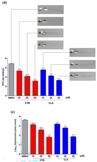 Next, the growth of M. abscessus CIP 104536T (R) in the etamycin-treated ZF was enumerated through quantification of colony-forming units (CFU) per embryo. After 5 days of treatment, a statistically significant reduction was observed in the number of CFU/embryo at 10, 25, and 50 μM of etamycin, demonstrating that etamycin inhibits M. abscessus CIP 104536T (R) replication in ZF. The CFU/embryo of etamycin observed at 50 μM was comparable to that of clarithromycin (50 μM concentration) (Figure 5d).