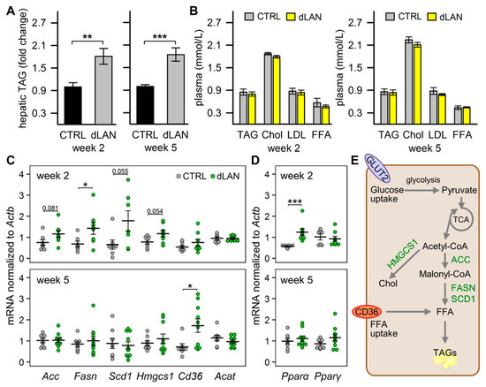 Hepatic metabolic homeostasis is maintained in accordance with circadian oscillations; therefore, circadian misalignment induced by disturbed LD cycles can impair the homeostasis and result in ectopic accumulation of lipids in the liver [20,27,30]. In our study, we examined this link in rats, which were exposed to dLAN for 2 or 5 weeks. We found that rats exposed to dLAN displayed higher hepatic TAG levels compared to controls (CTRL) after both 2 and 5 weeks (Figure 1A). Next, we analyzed, whether these dLAN-induced effects are associated with an altered lipid profile in the circulation. The analyses showed that CTRL and dLAN-exposed rats did not differ in plasma TAG, cholesterol, low-density lipoprotein (LDL) cholesterol, and free fatty acid (FFA) levels after either 2 or 5 weeks (Figure 1B). Besides circulating FFAs, there are other important sources contributing to an excessive accumulation of lipids in the liver, including de novo lipogenesis [31]. Following 2 weeks of dLAN, rats showed higher hepatic Fasn mRNA levels and a trend towards increased expression of lipogenic genes Acc, stearoyl-CoA desaturase 1 (Scd1), and 3-hydroxy-3-methylglutaryl-CoA synthase 1 (Hmgcs1) compared to CTRL (Figure 1C). These changes were not detected in rats following 5 weeks of dLAN, but this exposure resulted in the upregulation of fatty acid translocase (Cd36) in the liver (Figure 1C). Therefore, both de novo synthesis of fatty acids and an increased hepatic fatty acid uptake can participate in excessive hepatic lipid accumulation under dLAN conditions (Figure 1E). An excess of fatty acids in the liver can be expected to redirect acetyl-CoA from the tricarboxylic acid cycle (TCA) to the synthesis of ketone bodies [5], but dLAN exposure did not affect hepatic mRNA levels of mitochondrial acetyl-CoA acetyltransferase (Acat) (Figure 1C), an enzyme involved in the ketogenic pathway.