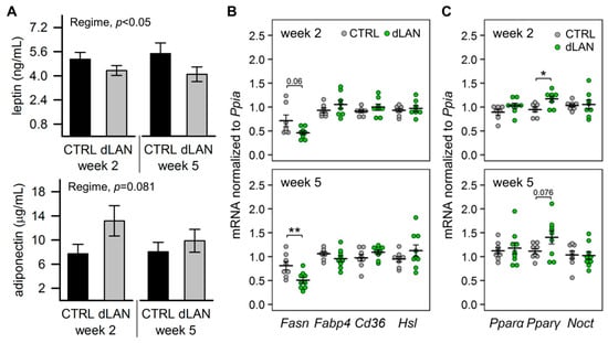 PPARγ is mainly expressed in the adipose tissue, where it functions not only as an important adipogenic regulator but is also involved in several other lipid-handling pathways [34]. Following 2 weeks in dLAN, rats displayed higher Pparγ mRNA levels in the epididymal fat pad compared to controls, and the same trend was found after 5 weeks in dLAN (Figure 3C). On the other hand, no changes were recorded in gene expression of Pparα and nocturnin (Noct) (Figure 3C), a key post-transcriptional regulator of metabolic pathways and circadian rhythms [35].